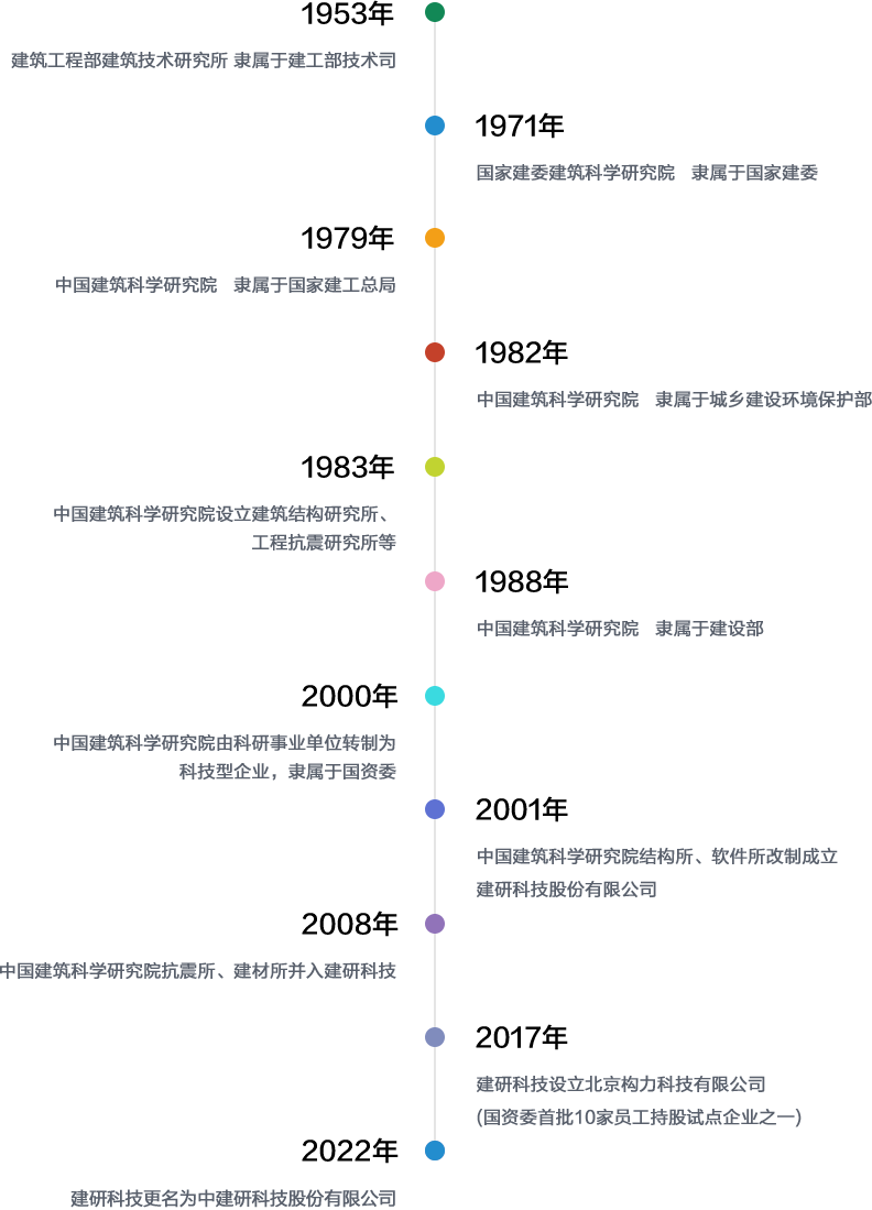 中建研科技股份有限公司(原名“建研科技股份有限公司”,以下簡稱“公司”)成立于2001年,其前身是國家建筑工程部于1953年組建的建筑技術研究所?,F隸屬于國務院國資委管理的中國建筑科學研究院有限公司,是由中國建研院結構所、抗震所、軟件所、建材所改制而成的高新技術企業,是中國建研院旗下核心優質品牌及資產。公司注冊資本5455.83萬元,其中中國建研院占股份總額的80.29%。2022年5月,“建研科技股份有限公司”名稱變更為“中建研科技股份有限公司”。