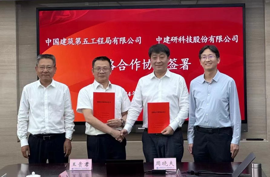 5月22日下午,中建研科技股份有限公司(以下簡稱“中建研科技”)與中國建筑第五工程局有限公司(以下簡稱“中建五局”)在長沙簽署戰(zhàn)略合作協(xié)議。中建研科技黨委書記、董事長劉軍進,中建五局副總經(jīng)理、總工程師李凱出席簽約儀式。中建研科技副總裁周曉夫,中建五局副總工程師、建筑設計院黨委書記王貴君代表雙方簽署戰(zhàn)略合作協(xié)議。