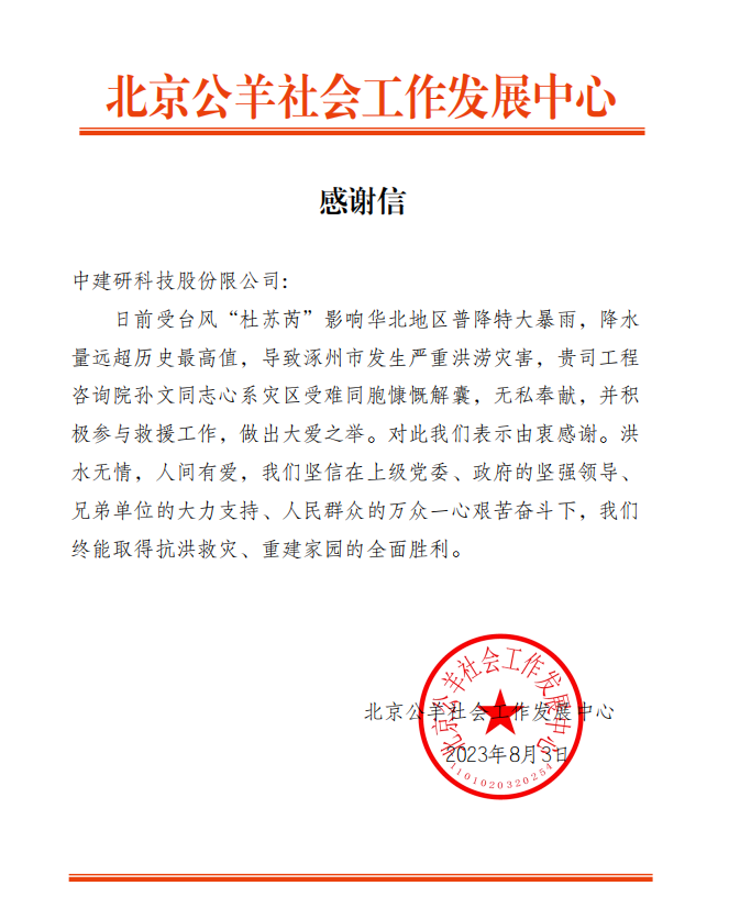 期間,中建研科技收到了“北京公羊社會工作發(fā)展中心”的感謝信,信中對孫文同志的無私奉獻(xiàn)和參與救援工作中做出的大愛之舉表示由衷感謝。