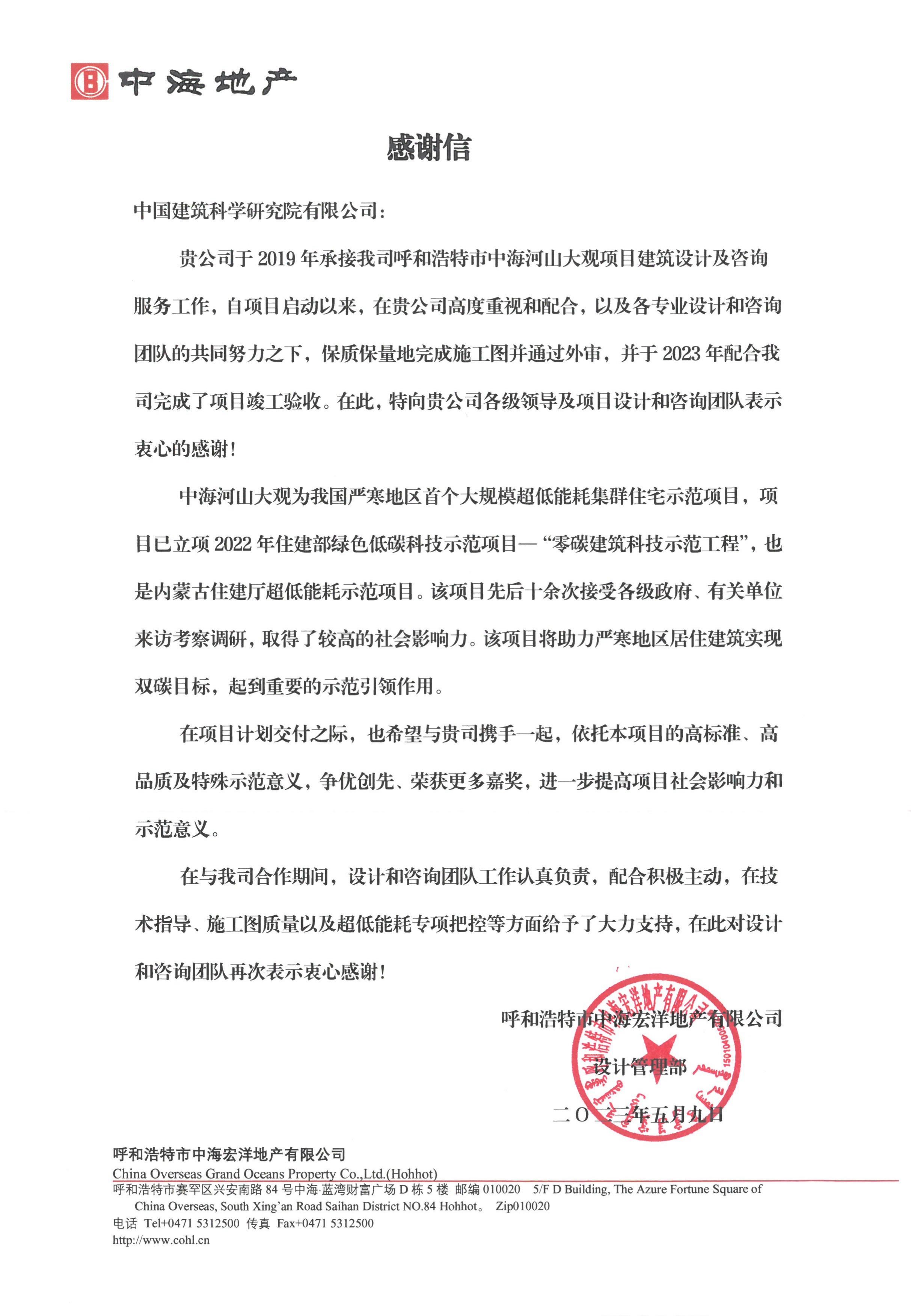 近期,中國(guó)建研院收到來(lái)自呼和浩特市中海宏洋地產(chǎn)有限公司的感謝信。信中表示,目前“呼和浩特市中海河山大觀項(xiàng)目”已經(jīng)順利完成了項(xiàng)目竣工驗(yàn)收,對(duì)中國(guó)建研院在項(xiàng)目建設(shè)過(guò)程中提供的設(shè)計(jì)與咨詢服務(wù)以及團(tuán)隊(duì)的精湛技術(shù)表示感謝。