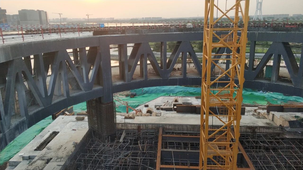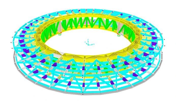 我們的工程師經(jīng)過多方案對比,最終選擇采用空間鋼結(jié)構(gòu)來實(shí)現(xiàn)觀景環(huán)廊。在內(nèi)環(huán)設(shè)置約1.5米寬、5.9米高的環(huán)形空間鋼桁架,鋼桁架下設(shè)三個(gè)支點(diǎn),與下部混凝土結(jié)構(gòu)相連。支點(diǎn)處的桁架豎腹桿加粗,直接深入下部混凝土結(jié)構(gòu)當(dāng)中,既保證了支座的安全性,又將鋼結(jié)構(gòu)的支點(diǎn)巧妙的“藏”了起來,輕松實(shí)現(xiàn)漂浮感。環(huán)形空間鋼桁架分約36節(jié),根據(jù)建筑布置基本均分網(wǎng)格。桁架外側(cè)設(shè)輻射狀鋼梁懸挑近8.5米,輻射狀鋼梁間設(shè)次梁,鋪設(shè)鋼筋混凝土板。
