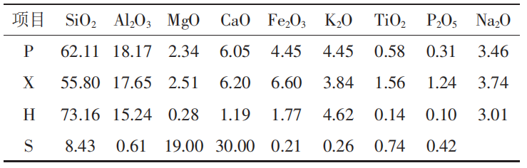 (4)天然巖石粉:陜西瑞德寶爾公司的片麻巖石粉(P)、新疆的玄武巖石粉(X)、廣西江門的花崗巖石粉(H)和云南的石灰石粉(S)。