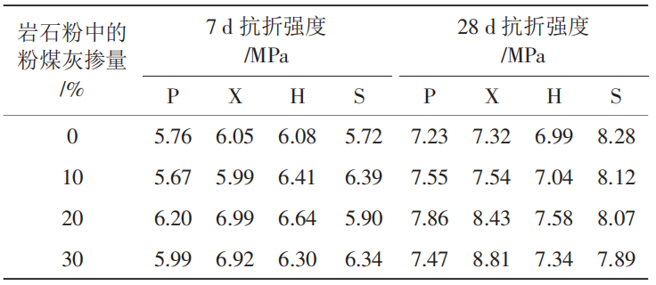 表2:不同巖石粉與粉煤灰復(fù)合對膠砂抗折強(qiáng)度的影響