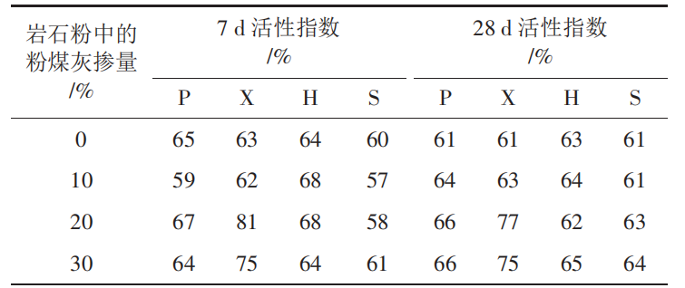 (2)在粉煤灰摻量較小的情況下,不同巖石粉對粉煤灰的敏感度不一樣。玄武巖石粉的敏感度最大,粉煤灰摻量改變,玄武巖石粉組活性指數(shù)最大值比最小值增加了 30%,其它巖石粉組則均在 10%范圍以內(nèi)。
