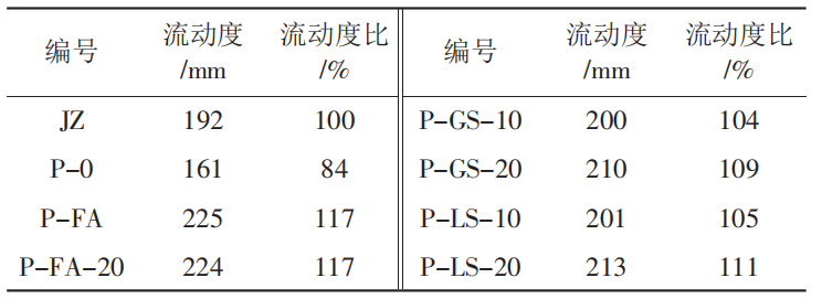 流動度比和活性指數(shù)參考 GB/T 2419—2005《水泥膠砂流動度測定方法》和 GB/T 17671—1999《水泥膠砂強(qiáng)度檢驗(yàn)方法(ISO 法)》進(jìn)行測試。
