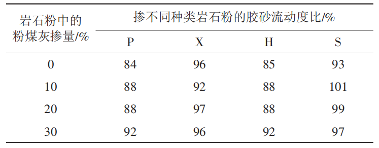 不同巖石粉與粉煤灰復(fù)合對水泥膠砂流動性的影響