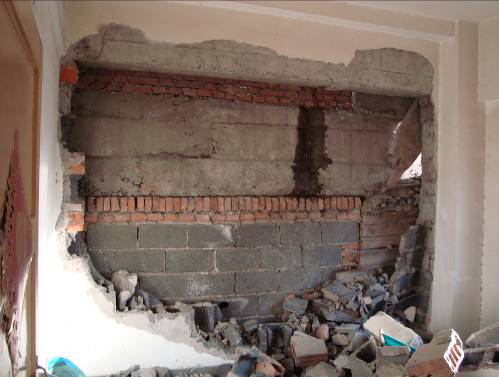施工模板等雜物填塞防震縫,相鄰兩棟建筑地震時相互碰撞、擠壓,導(dǎo)致其中一棟建筑的填充墻倒塌