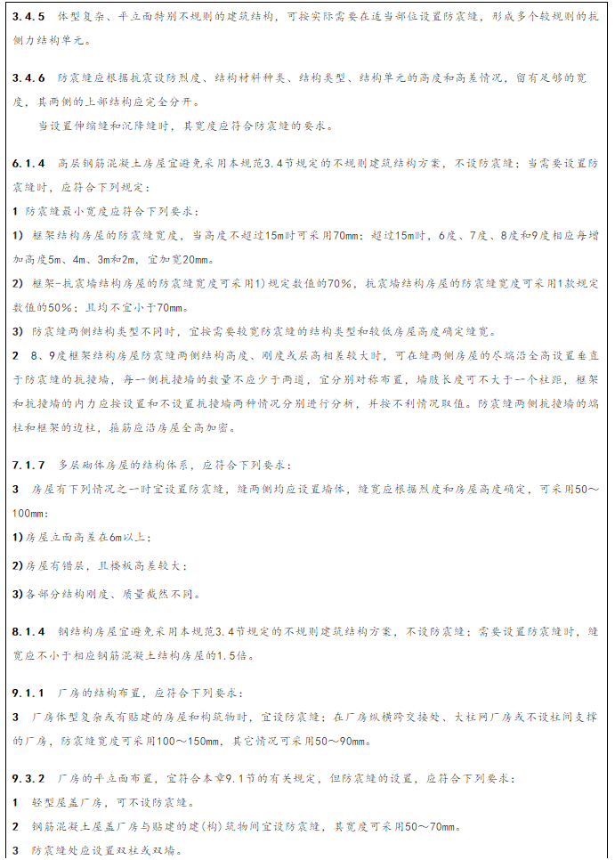 我國的74規(guī)范(《工業(yè)與民用建筑抗震設(shè)計規(guī)范(試行)》TJ11-74)在第20、35、48、59條分別對多層磚房、空曠磚房和磚柱廠房、單層混凝土廠房、多層混凝土框架結(jié)構(gòu)的防震縫設(shè)置作出了規(guī)定。74規(guī)范的主導(dǎo)思想是“倡導(dǎo)”設(shè)縫,程度用詞一般為“宜”和“應(yīng)”!