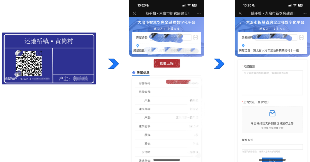 監(jiān)管系統(tǒng)數(shù)據(jù)庫(kù)可與對(duì)應(yīng)部門數(shù)據(jù)庫(kù)充分對(duì)接,為每棟房屋生成專屬的二維碼房牌,實(shí)現(xiàn)線上線下一體化管理,為農(nóng)房安全常態(tài)化巡查和定期體檢提供了數(shù)據(jù)和系統(tǒng)支持。農(nóng)戶和相關(guān)管理人員可通過掃描二維碼上報(bào)房屋安全問題,實(shí)現(xiàn)農(nóng)房安全監(jiān)管“人人參與”。將農(nóng)戶自查、鎮(zhèn)村排查、縣級(jí)巡查、執(zhí)法檢查,以及群眾監(jiān)督相結(jié)合,能夠及時(shí)發(fā)現(xiàn)并采取有效措施消除安全隱患。