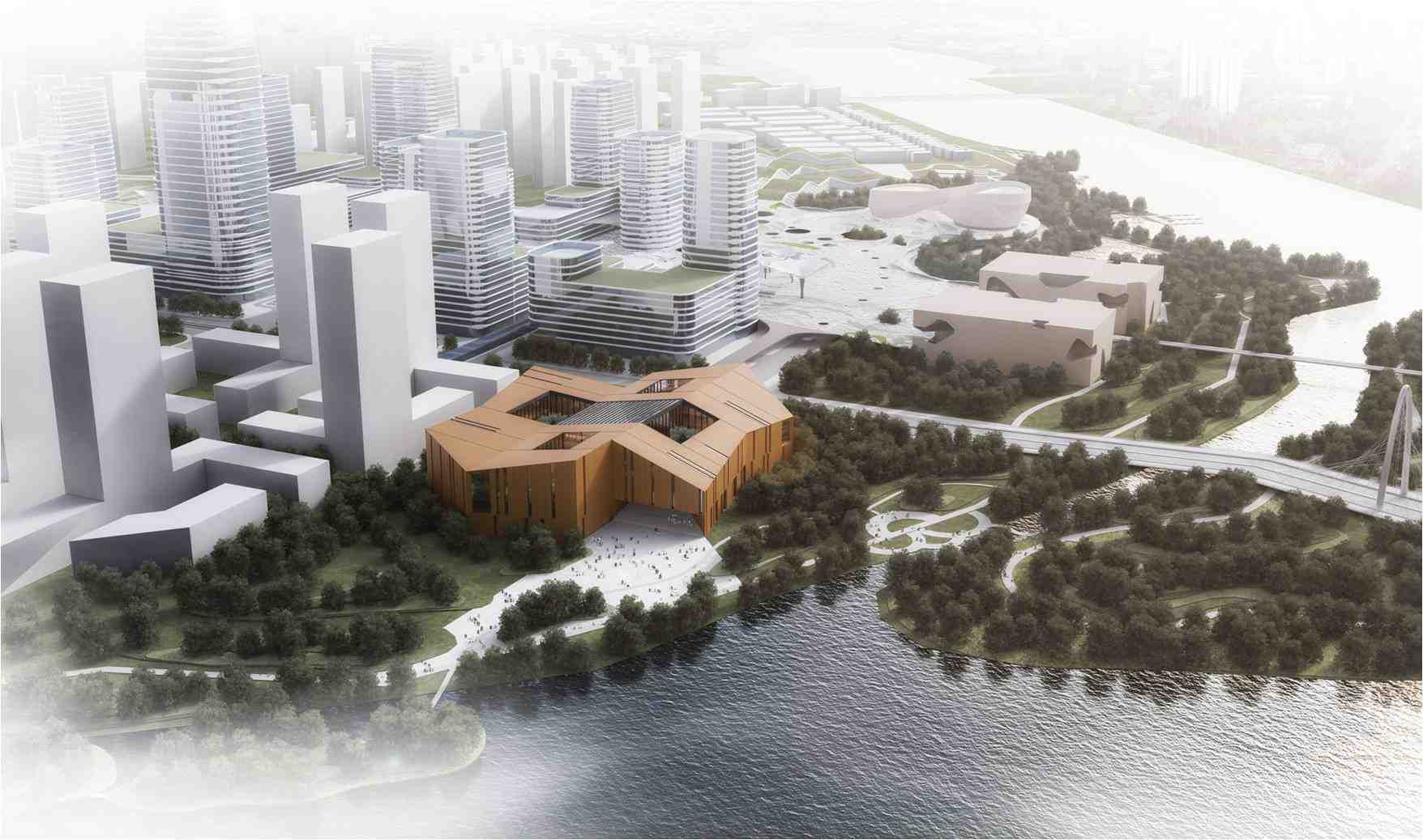 在布局上,兩館統(tǒng)一在一個(gè)建筑形體中,居中布置了共享大廳,圖書館和檔案館的功能,分別設(shè)置在建筑的西北側(cè)和東南側(cè)。在共享大廳的南北兩側(cè)設(shè)置了室外庭院,共享大廳、室外庭院、大臺(tái)階共同將西側(cè)城市道路與沿河景觀相連接,為市民提供一休閑、交流的文化場(chǎng)所。 緊湊的建筑布局及外觀,不僅體現(xiàn)了功能的要求,也反映了邏輯鮮明、不證自明的空間秩序。地塊呈不規(guī)則形態(tài)。建筑外形采用折面的建筑語言,這是建筑對(duì)不規(guī)則場(chǎng)地的主動(dòng)適應(yīng),使得建筑能夠更好地與環(huán)境融為一體,生長(zhǎng)于這一特定場(chǎng)所的建筑成為了獨(dú)一無二的作品。與自由不規(guī)則的外輪廓相比,建筑的內(nèi)部空間通過十分規(guī)則的網(wǎng)格系統(tǒng)進(jìn)行分割組織,使得各個(gè)功能區(qū)得以明確的界定,并實(shí)現(xiàn)高效的內(nèi)部交通組織與經(jīng)濟(jì)合理的結(jié)構(gòu)選型。折面的屋頂是折形立面的延續(xù),在使用了相同的立面材料后,整個(gè)建筑外觀渾然一體。外墻材料采用彩GRC掛板,而且選用明快的橘紅色,結(jié)合折線變化的建筑造型,簡(jiǎn)潔并富有現(xiàn)代感,成為天津中新生態(tài)城核心區(qū)重要的標(biāo)志性建筑。