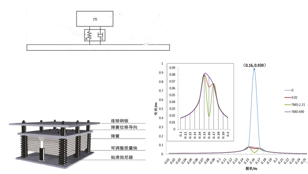 TMD減振方法是一種控制結(jié)構(gòu)振動響應(yīng)的減振措施。通過設(shè)置一個附加的單自由度減振體系,將原結(jié)構(gòu)的振動能量吸收到減振體系。附加振動體系中的阻尼器耗能,最終消耗原結(jié)構(gòu)的振動能量,大幅減小原結(jié)構(gòu)的振動反應(yīng),達到舒適度要求。
