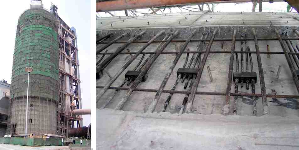 筒倉高58m,外徑23m,壁厚380mm,采用環(huán)向配置預應力筋,環(huán)、豎向配置單層鋼筋網的混凝土疊合層法進行加固。