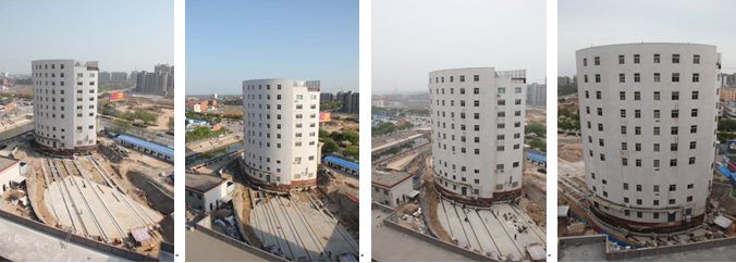 陵縣農(nóng)村信用合作聯(lián)社辦公樓建于1996年,地上八層,地下一層,地上結(jié)構(gòu)采用鋼筋混凝土框架結(jié)構(gòu),現(xiàn)澆鋼筋混凝土樓屋蓋,地下室為鋼筋混凝土箱形基礎(chǔ)。因建筑規(guī)劃調(diào)整,需將該建筑帶地下室整體斜向直線(xiàn)(西北向)平移52.3m。平移時(shí)采用我司研發(fā)的大型結(jié)構(gòu)同步平移控制系統(tǒng)。該工程于2015年5月8日滑移就位,滑移實(shí)際工期7天,滑移過(guò)程平穩(wěn)順暢。