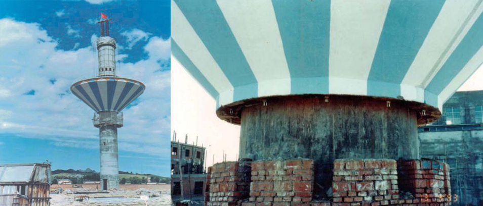 河北承德地區(qū)鋼鐵水泥廠擴(kuò)建的150m3高爐配套工程,容量500m3,高32m的倒錐形水塔是當(dāng)時(shí)國內(nèi)此類水塔中最高最大的水塔。塔柱直徑4m,采用了滑模施工;錐形水柜在地面預(yù)制。水柜的重量大,提升及安裝工作是本工程施工的關(guān)鍵。該工程采用以鋼絞線為吊索的液壓自動(dòng)提升裝置進(jìn)行水柜的提升,成功地完成了300t重的倒錐形水柜的提升和安裝工作,其水平安裝精度達(dá)到了驗(yàn)收標(biāo)準(zhǔn)。此法吊裝,具有提升速度快、作可靠、便于調(diào)整、減輕工人勞動(dòng)強(qiáng)度等,是當(dāng)時(shí)國內(nèi)首次應(yīng)用的新工藝新技術(shù)。