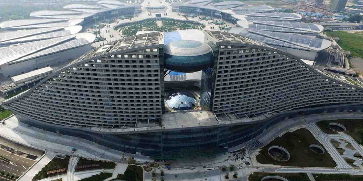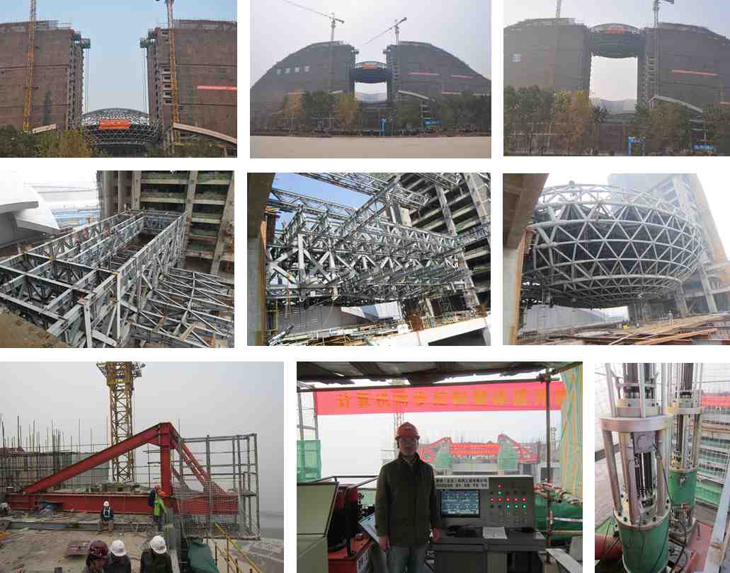 星空會(huì)所橢球鋼結(jié)構(gòu)位于武漢國博洲際酒店的頂部18層~20層的中間連體部位,外觀形式為橢圓球,橢圓球內(nèi)部由兩層鋼桁架結(jié)構(gòu)組成,外表為單層空間網(wǎng)格結(jié)構(gòu),結(jié)構(gòu)總重約1350t。結(jié)構(gòu)內(nèi)部高度21.4m,頂部標(biāo)高約97m。由于橢圓球鋼結(jié)構(gòu)為非對(duì)稱且節(jié)點(diǎn)復(fù)雜、拼裝場(chǎng)地受限制,同時(shí)提升高度大、空中對(duì)接難度更大,因此施工難度非常大。為了達(dá)到同步提升對(duì)結(jié)構(gòu)平衡和同步控制的要求,本工程采用了我司研發(fā)的基于伺服技術(shù)和PLC控制系統(tǒng)的大型結(jié)構(gòu)整體同步移位系統(tǒng)。