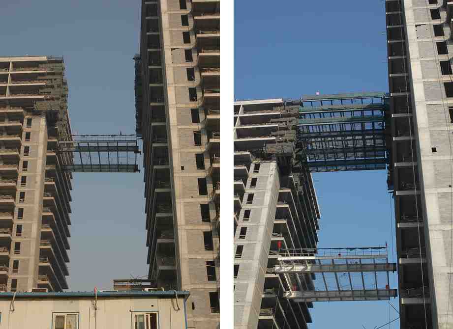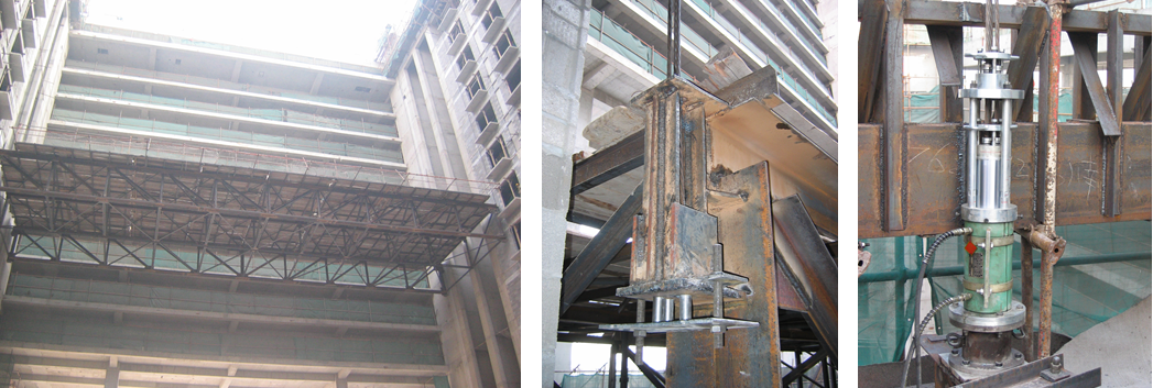 北京科技大學(xué)鋼結(jié)構(gòu)連廊共分四層,跨度為25.2m。現(xiàn)場(chǎng)若采用高空拼裝,則需搭設(shè)近80m高的腳手架,經(jīng)濟(jì)成本過高;因此采用液壓千斤頂整體提升工藝完成連廊鋼結(jié)構(gòu)施工。實(shí)施時(shí),在標(biāo)高12.5m(3層)處將各層連廊鋼結(jié)構(gòu)加工完成,連廊兩端設(shè)置懸臂梁牛腿,之后通過設(shè)置在懸臂牛腿上的千斤頂將連廊鋼結(jié)構(gòu)整體提升就位。