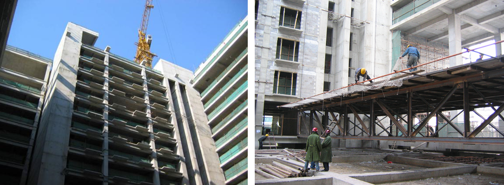 超輕弧形鋁板幕墻系統(tǒng)提升。具有提升高度高(190m)、帶維護(hù)結(jié)構(gòu)重量極輕對(duì)風(fēng)極度敏感、周邊邊界復(fù)雜、局部提升后仍需滑移就位等特點(diǎn)。采用“豎向張緊拉索+水平纜風(fēng)”作為提升抗側(cè)體系,部分靠近塔樓側(cè)幕墻單元采用“提升+高空滑移就位”的安裝方案實(shí)現(xiàn)幕墻系統(tǒng)的高效安裝。
