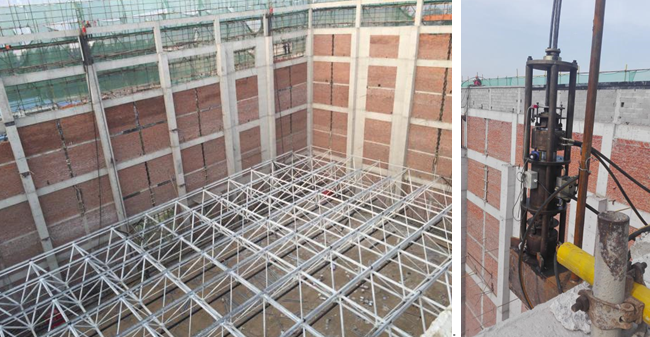 萬泉寺綜合樓鋼結(jié)構(gòu)部分主要結(jié)構(gòu)形式為大跨度鋼結(jié)構(gòu)轉(zhuǎn)換桁架,桁架跨度為53.5m,單件構(gòu)件重量超過60t,鋼結(jié)構(gòu)總重約600t。針對(duì)轉(zhuǎn)換桁架跨度大、重量大的特點(diǎn),采用“原位拼裝、整體提升”的施工方案。工程實(shí)施時(shí)引入我司自主研發(fā)的液壓移位同步移動(dòng)控制系統(tǒng)進(jìn)行桁架的整體同步提升,控制精度在5mm以內(nèi)。